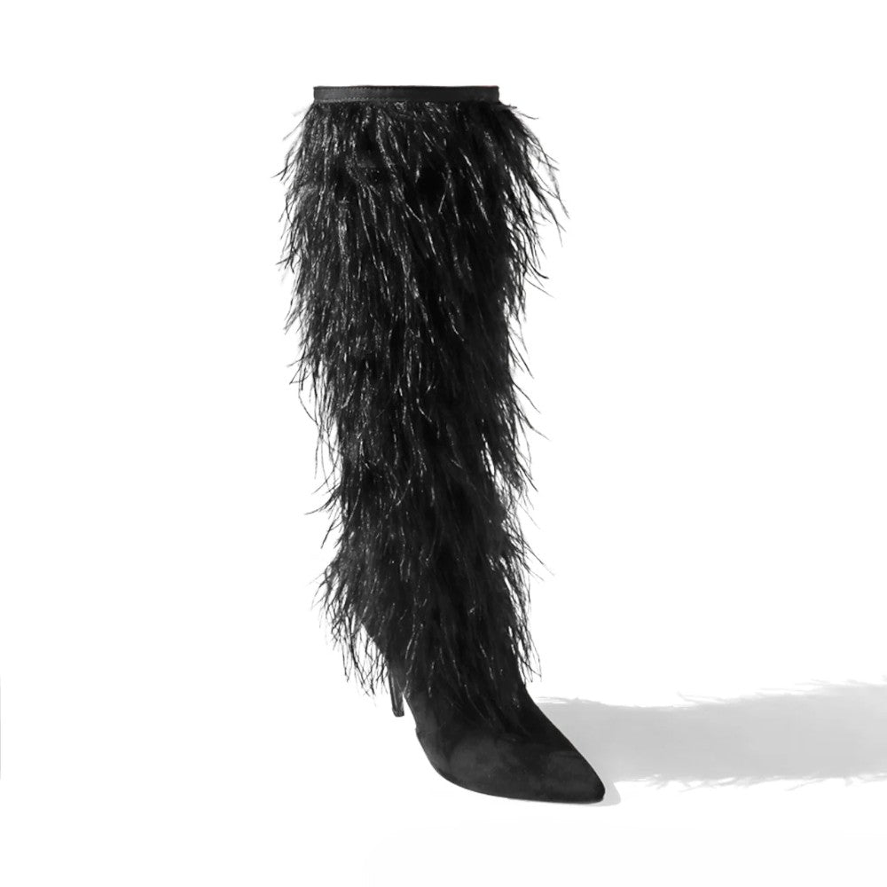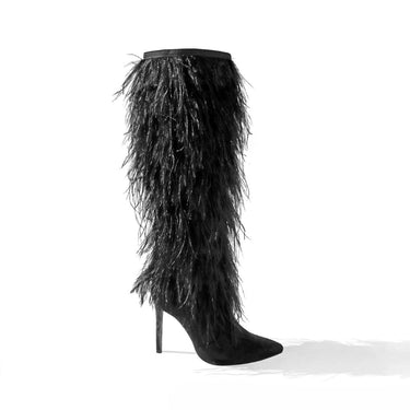 Crafted with a combination of premium microfiber and luxurious ostrich feather, these Stiletto Thigh High Boots boast an elegant 4-inch heel and a pointy toe for a sleek and sophisticated look. Elevate your style with these show-stopping boots.