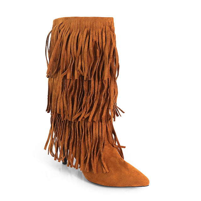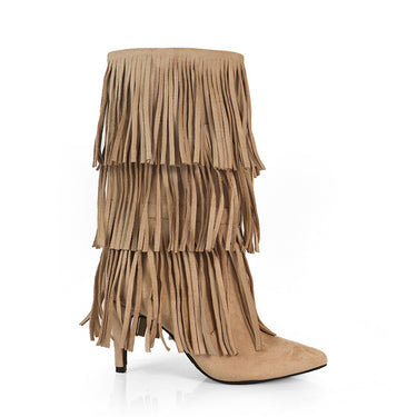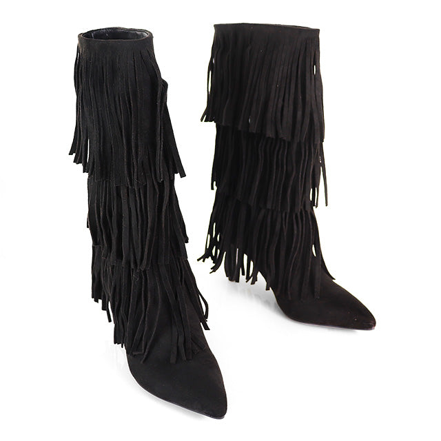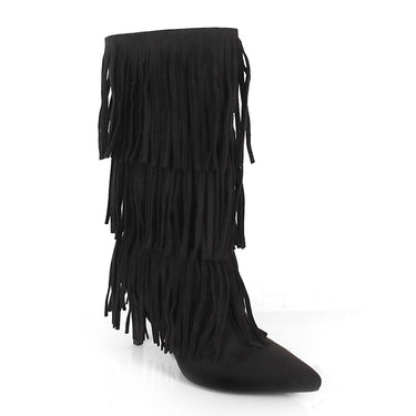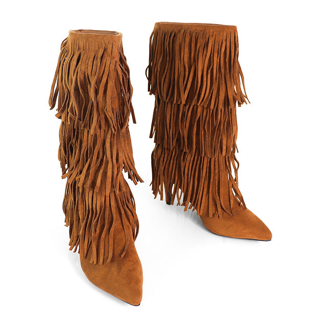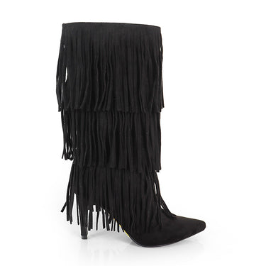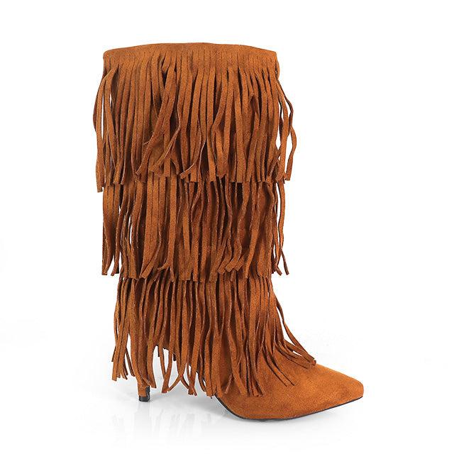 Make a statement this season with these chic fringe knee-high boots that instantly elevate any outfit. Crafted from soft suede, they showcase cascading fringe layers that move gracefully with every step, bringing a playful western-inspired edge. The pointed toe and comfortable design make them a perfect match for dresses, skirts, or jeans—ideal for nights out, themed events, or a stylish Halloween party look. Whether you’re dressing up for fun or everyday fashion, these boots add effortless flair and confidence to your style.
