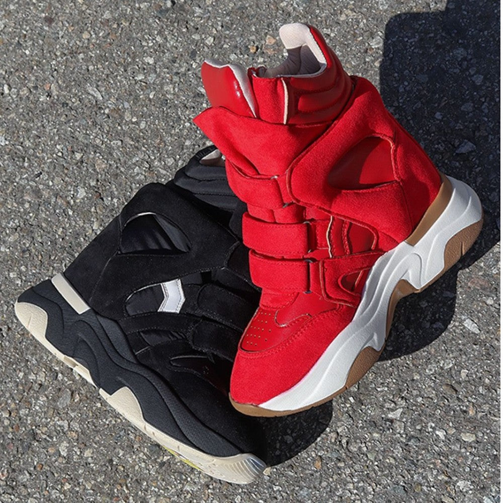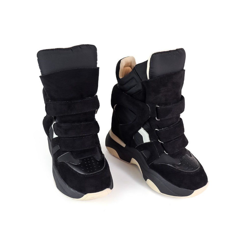 Elevate your footwear collection with this high-top women's sneaker featuring triple hook-and-loop straps for a secure, adjustable fit. The quilted padded collar enhances comfort and ankle support, while the concealed wedge adds subtle height without compromising stability. Designed for both style and function, this sneaker seamlessly blends modern aesthetics with everyday wearability.