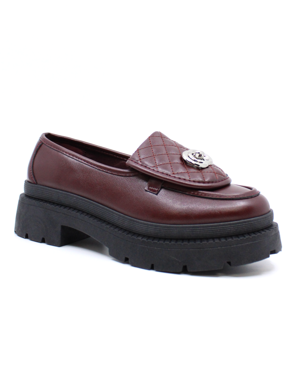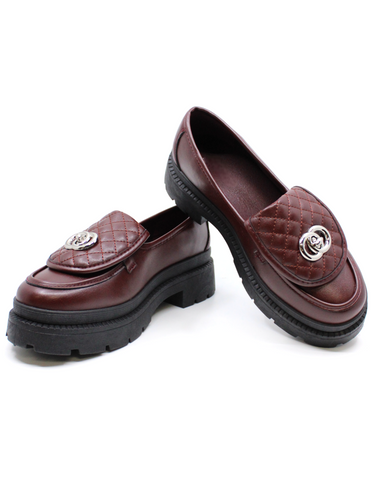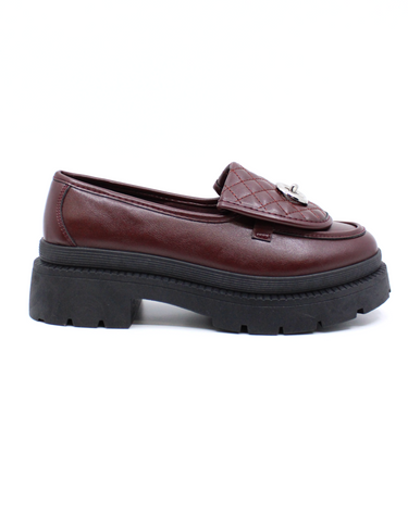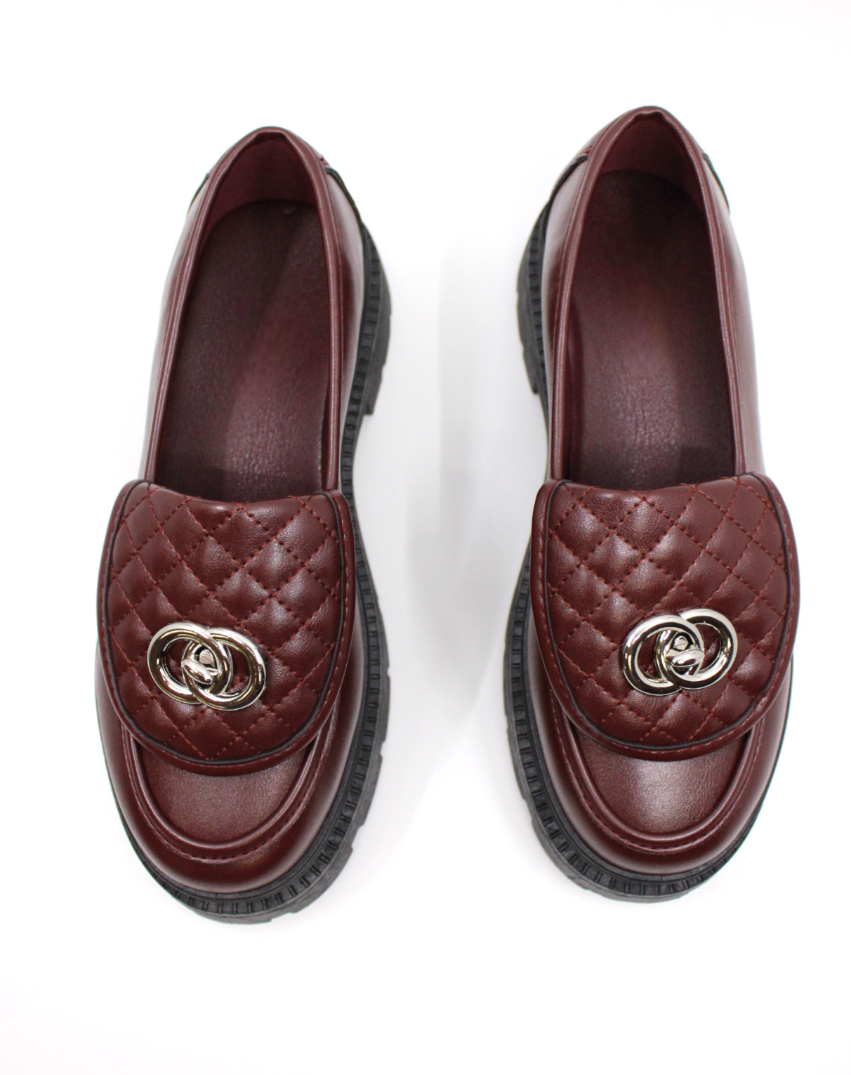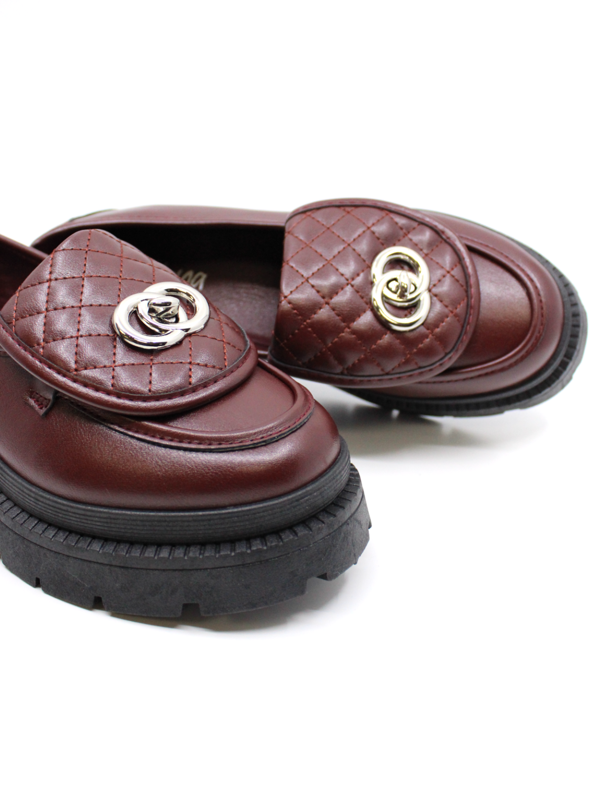 Add a bold touch to your wardrobe with these Liliana Quilted Chain Accent Chunky Loafers in a deep burgundy hue. Designed with a quilted faux leather upper and accented by a sleek metallic chain, these slip-on loafers blend sophistication with a modern edge. The chunky black lug sole provides all-day comfort and lasting durability—perfect for everyday wear or elevating casual outfits. A great choice for fall and winter, they pair effortlessly with jeans, skirts, or tailored pants for a polished look