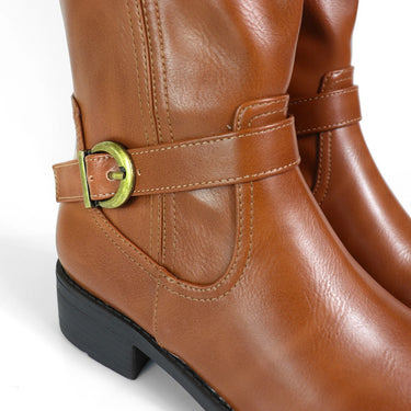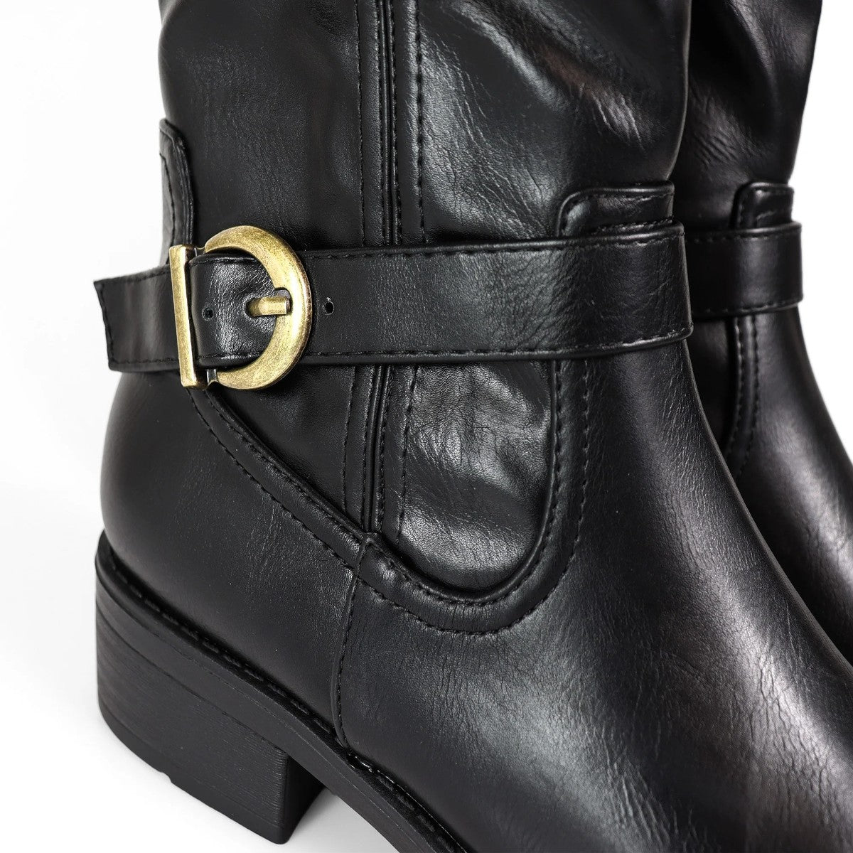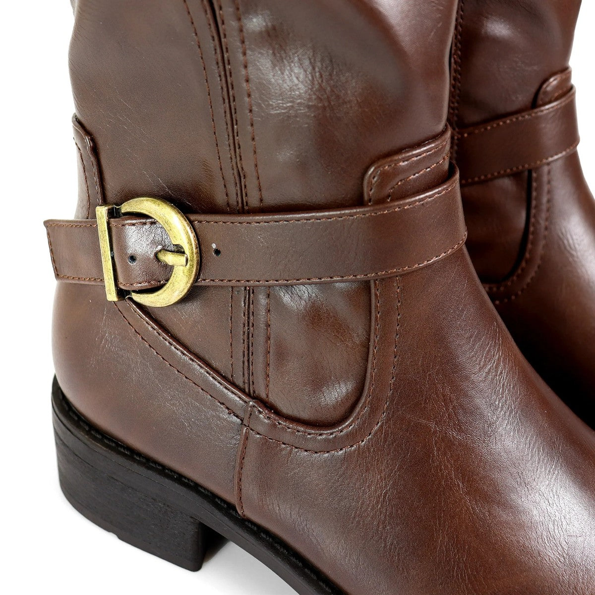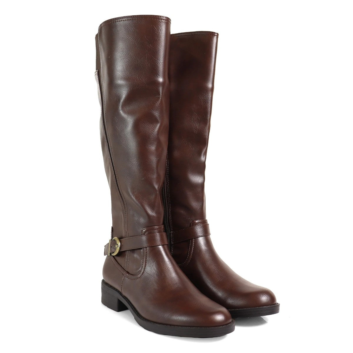 Add a touch of sophistication to your everyday style with these classic riding knee-high boots crafted for all-day comfort and functionality. Designed with a tall streamlined shaft, supportive low block heel, and a refined buckle strap accent, they pair effortlessly with jeans, leggings, or dresses. A convenient side zipper allows for easy wear, while the durable sole provides long-lasting support for daily activities. Perfect for work, casual outings, or seasonal looks, these boots deliver a versatile and polished finish to your fall and winter wardrobe.