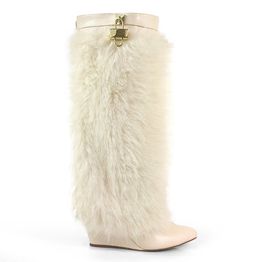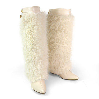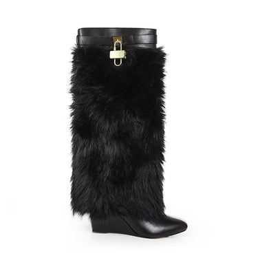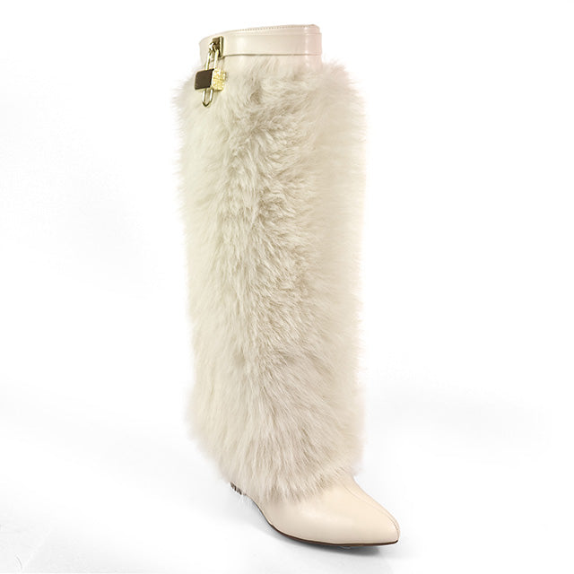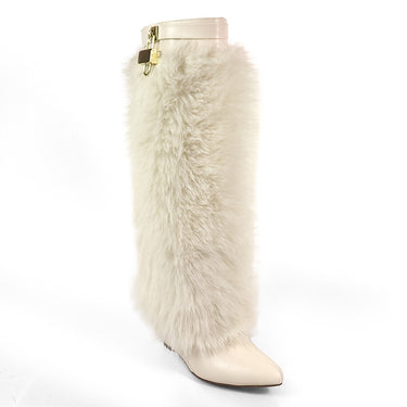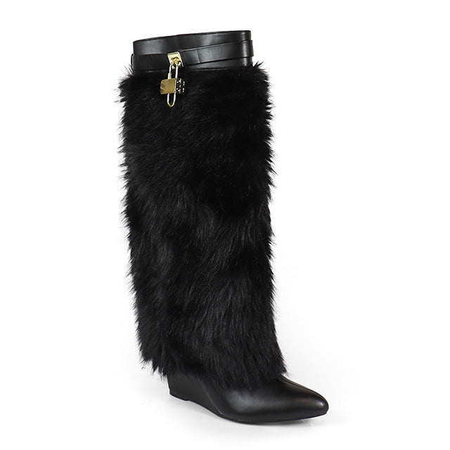 Make a bold fashion statement this season with these knee-high boots crafted for both style and comfort. Wrapped in plush faux fur for a luxurious textured look, they bring instant elegance and warmth to your wardrobe. The sleek pointed toe and smooth faux leather finish create a refined profile, while the gleaming buckle detail at the top adds a modern, polished touch. Versatile enough to pair with jeans, skirts, or dresses, these boots are the perfect blend of cozy functionality and high-fashion appeal—ideal for elevating your everyday outfits or completing a chic evening ensemble.