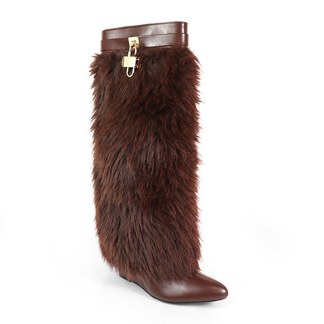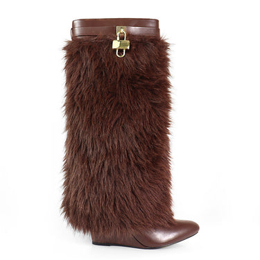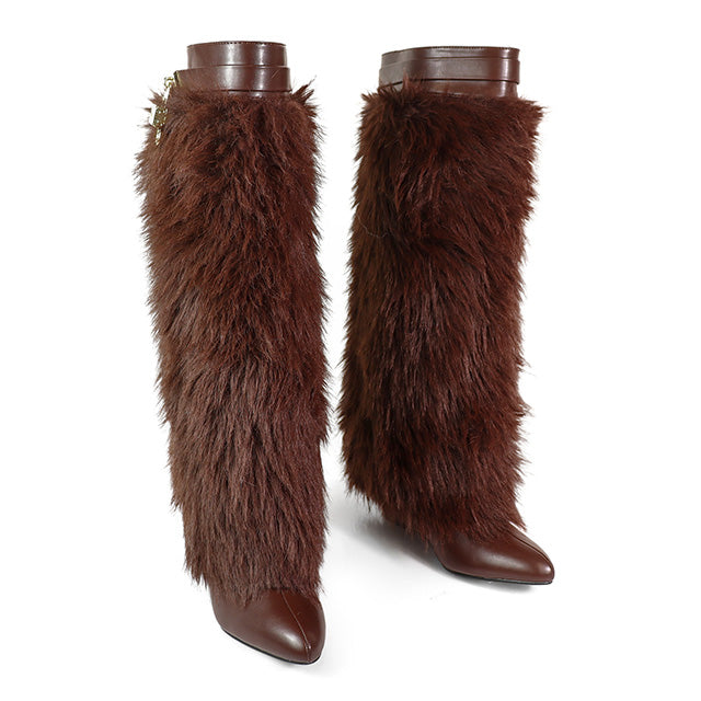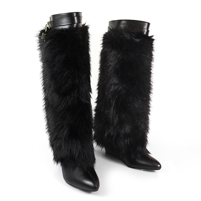 Women’s Knee-High Faux Fur Boots with Buckle Accent and Pointed Toe