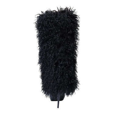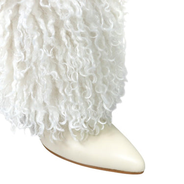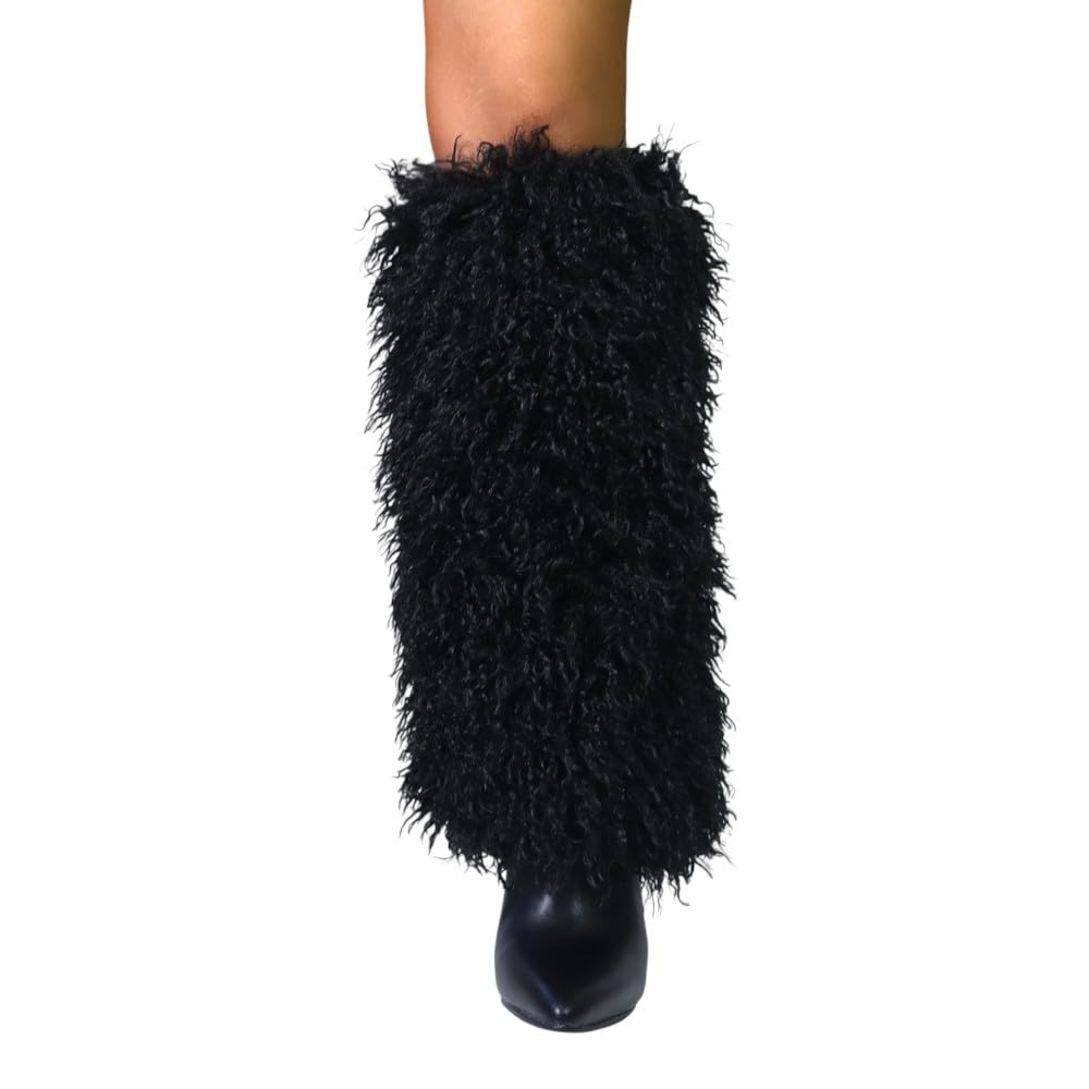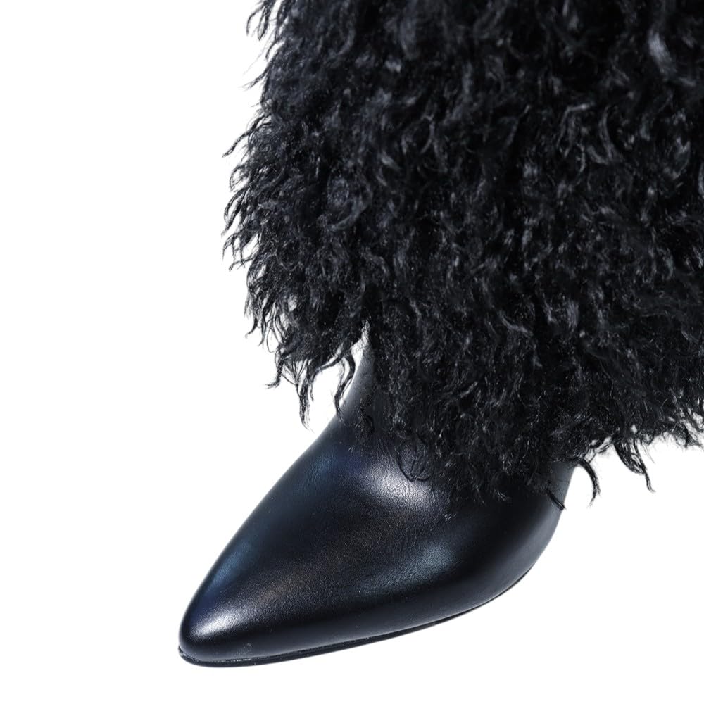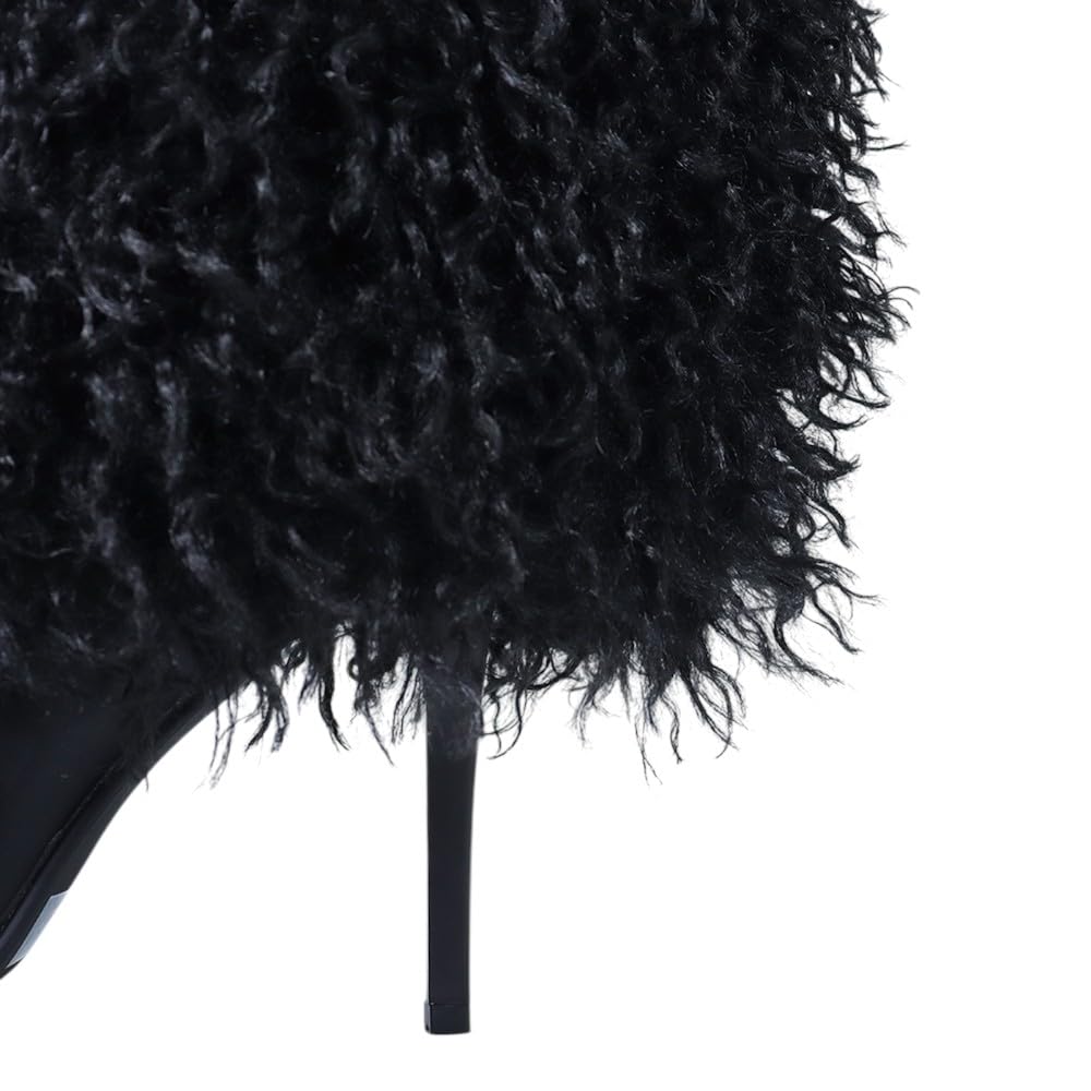 Crafted with a smooth faux leather base and finished with a fluffy, curly faux fur overlay, these knee-high boots offer standout texture while maintaining a polished profile. The 4-inch stiletto heel adds height and confidence, while the side zipper closure ensures easy on and off with a secure, non-stretch fit. A 14.5-inch shaft circumference delivers a tailored feel that holds its shape throughout wear.
