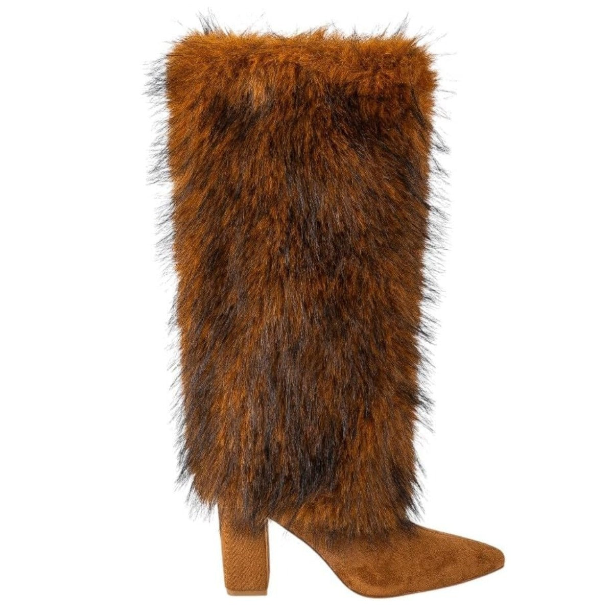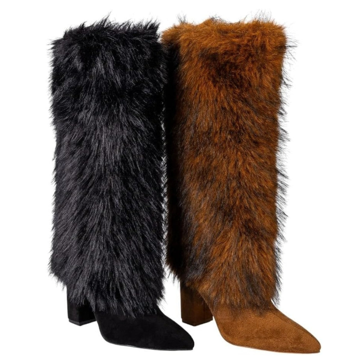 Women's Knee-High Faux Fur Boots – Pointed Toe Block Heels for Winter & Halloween Party Outfits