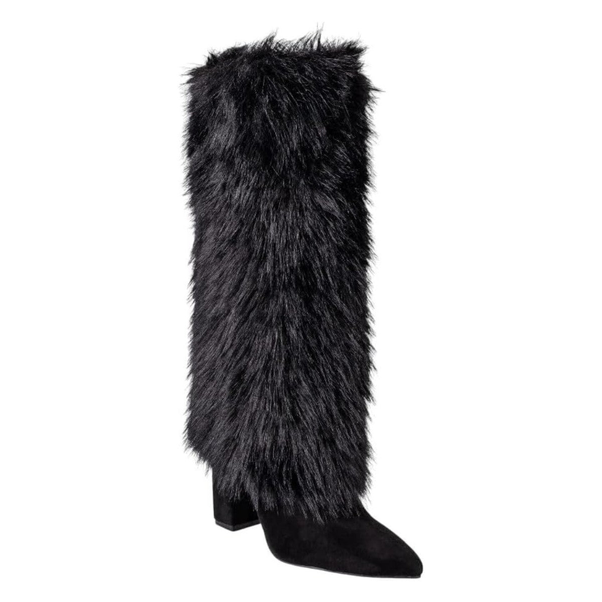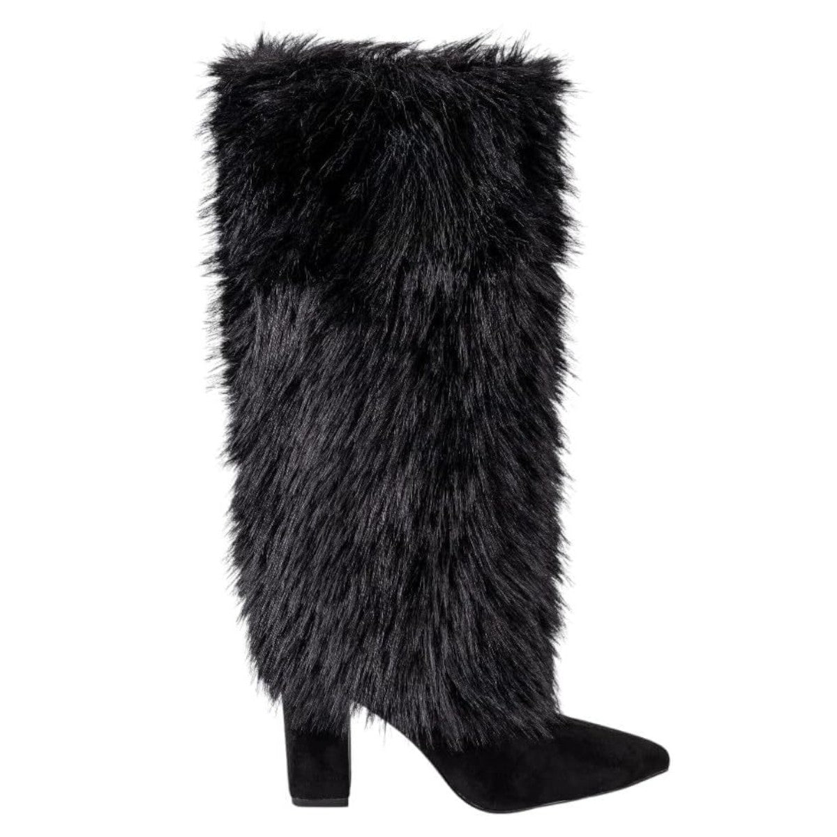 Make a bold fashion statement with these stunning faux fur knee-high boots, perfect for elevating any winter outfit. Featuring a soft faux suede base and wrapped in rich, fluffy faux fur, they combine warmth, comfort, and high-end style. The pointed toe and sturdy block heel create a sleek, elongated silhouette while offering balance and confidence with every step. Ideal for parties, nights out, or stylish cold-weather looks, these boots pair effortlessly with dresses, skirts, or jeans for a glamorous finish that commands attention wherever you go.