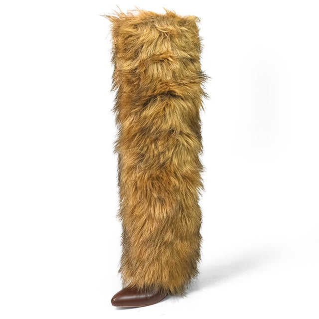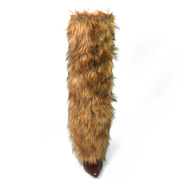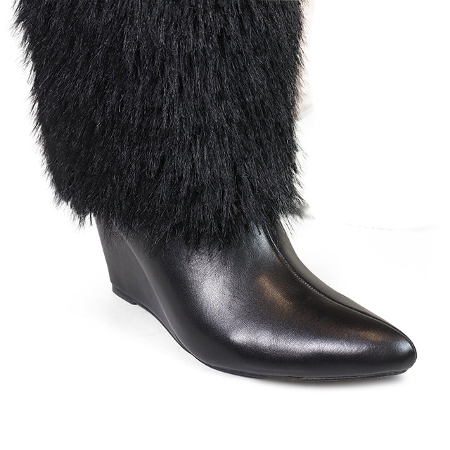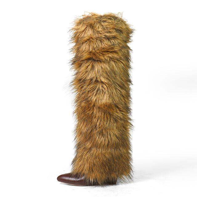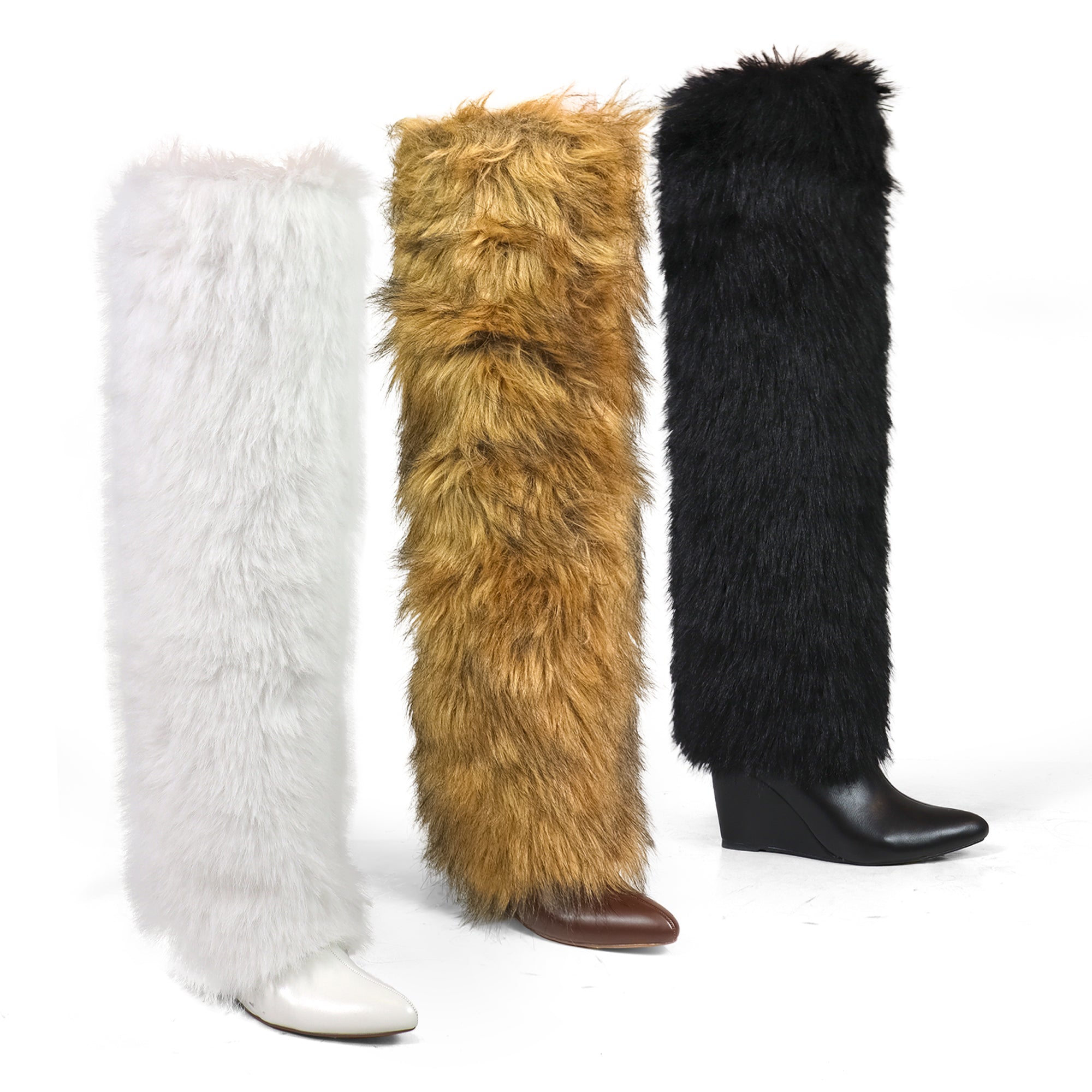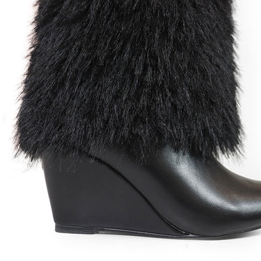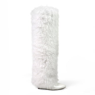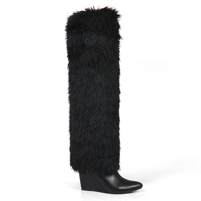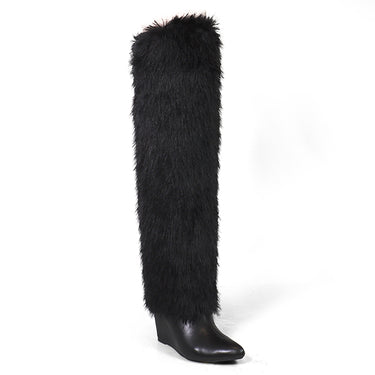 Women Over The Knee Faux Fur Boots Closed Toe Winter Fashion Wedge Heel Boots