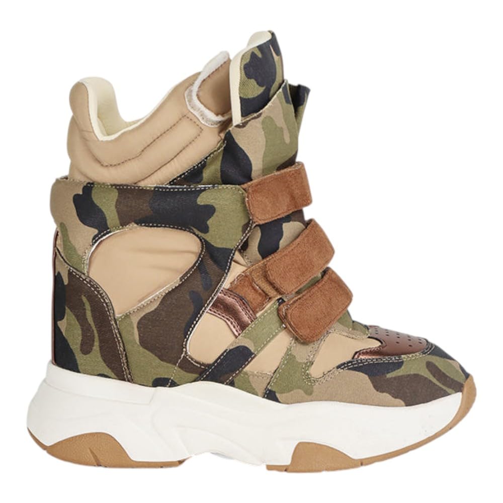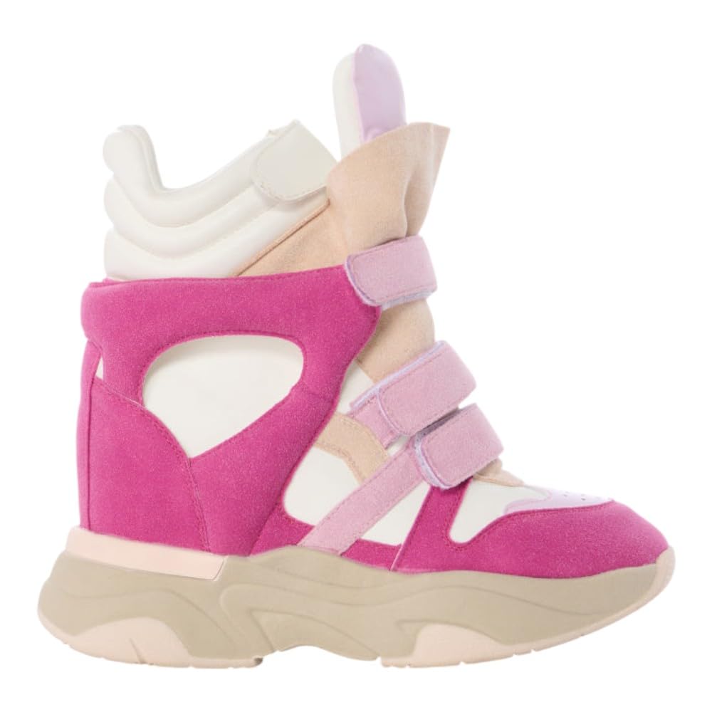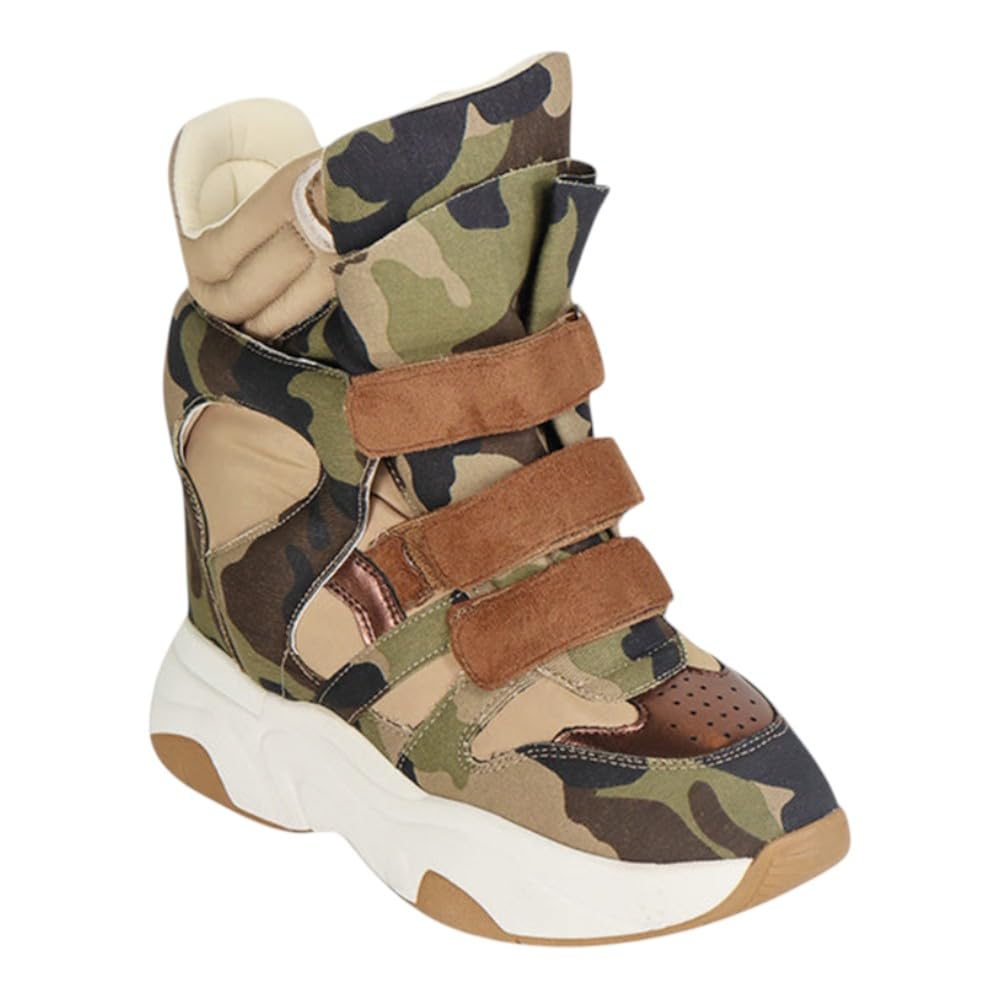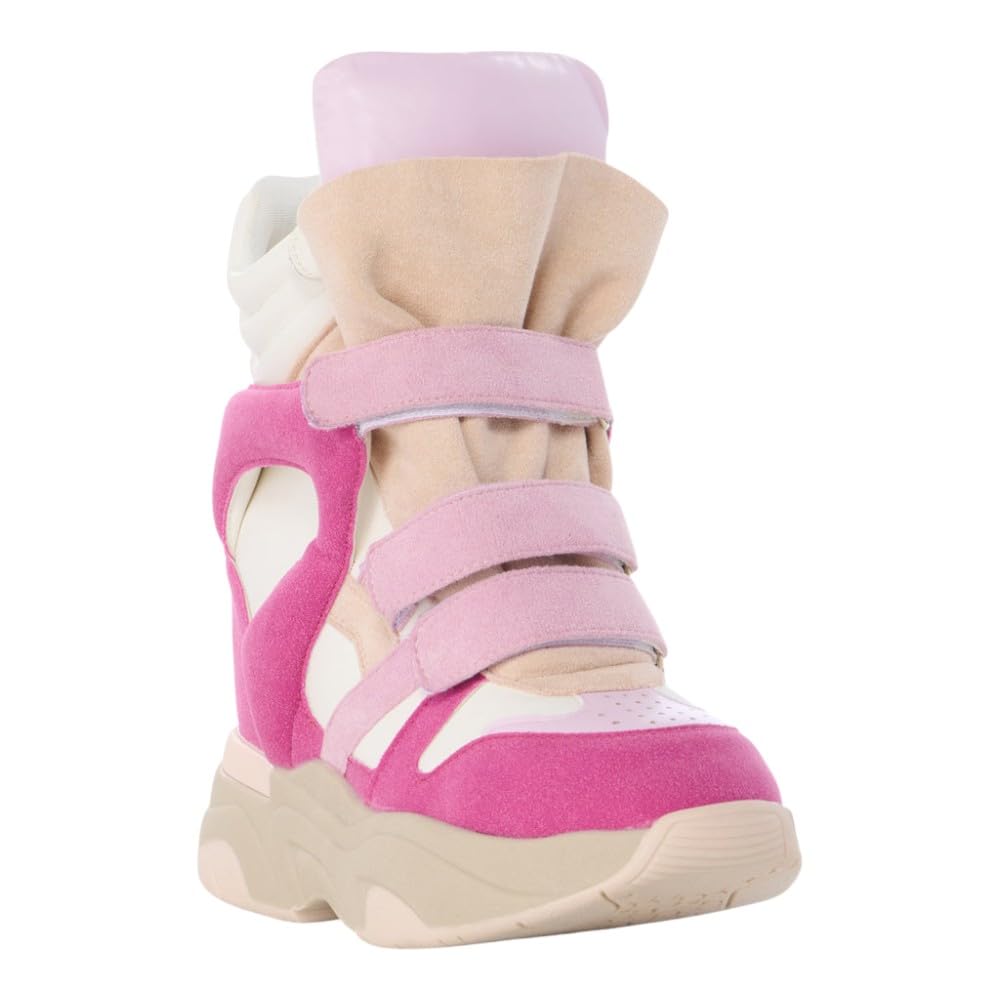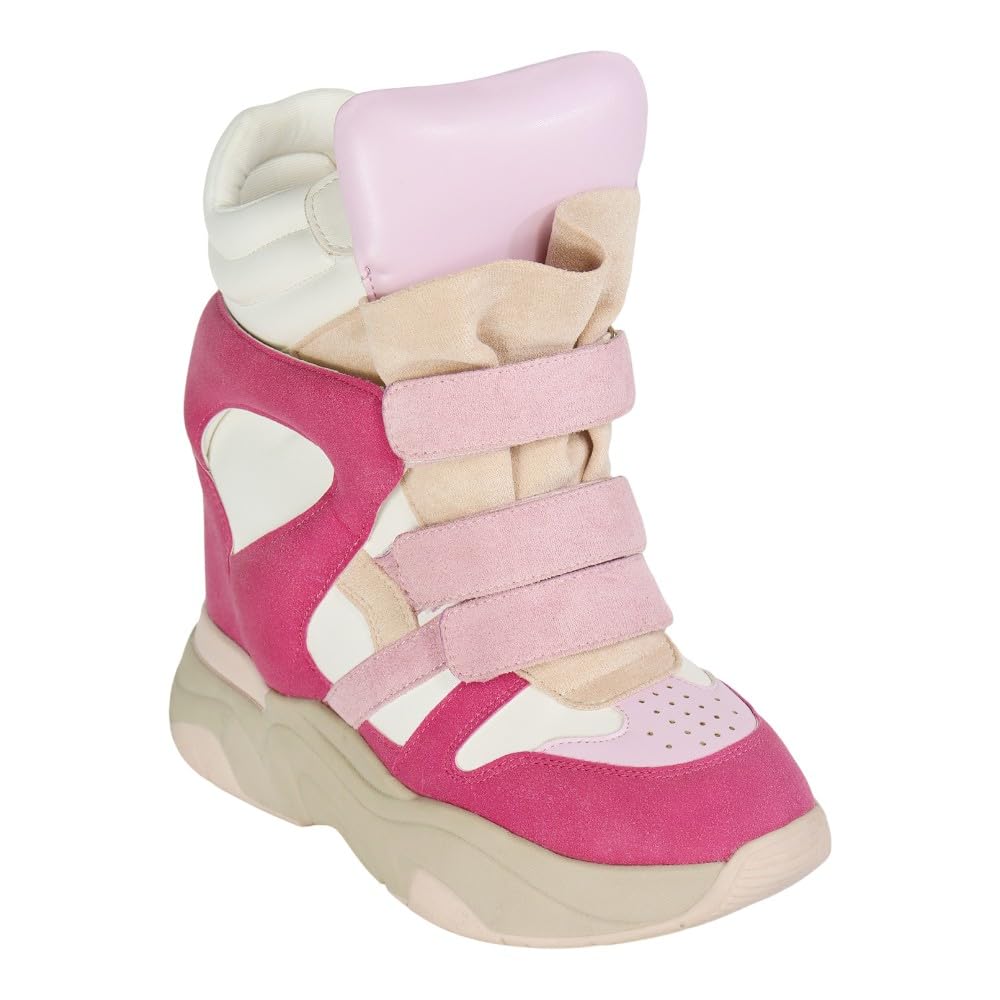 Elevate your footwear collection with this high-top women's sneaker featuring triple hook-and-loop straps for a secure, adjustable fit. The quilted padded collar enhances comfort and ankle support, while the concealed wedge adds subtle height without compromising stability. Designed for both style and function, this sneaker seamlessly blends modern aesthetics with everyday wearability.