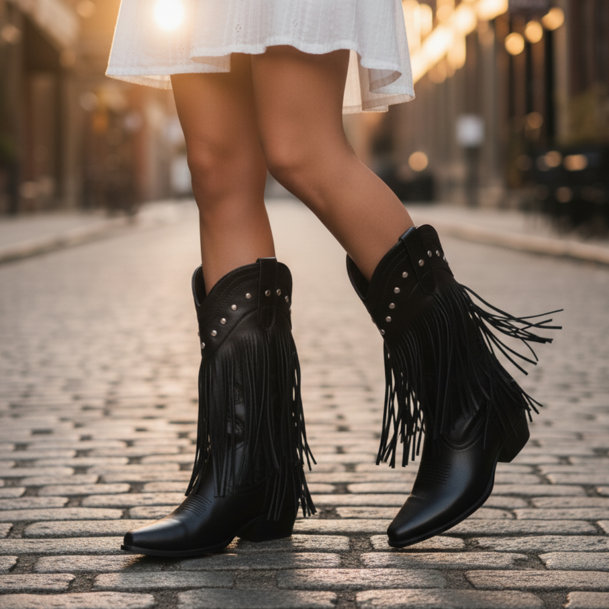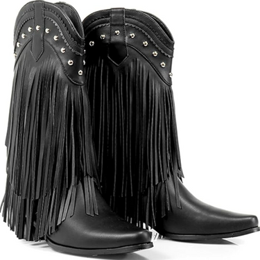 Step into bold Western flair with these studded fringe ankle booties. Designed with a pointed toe and chunky heel, these boots bring effortless edge to any outfit. The statement fringe and metallic stud accents make them perfect for festival looks, denim days, or adding a rugged-chic touch to your style. Slip-on design with side zipper ensures comfort and convenience all day long.